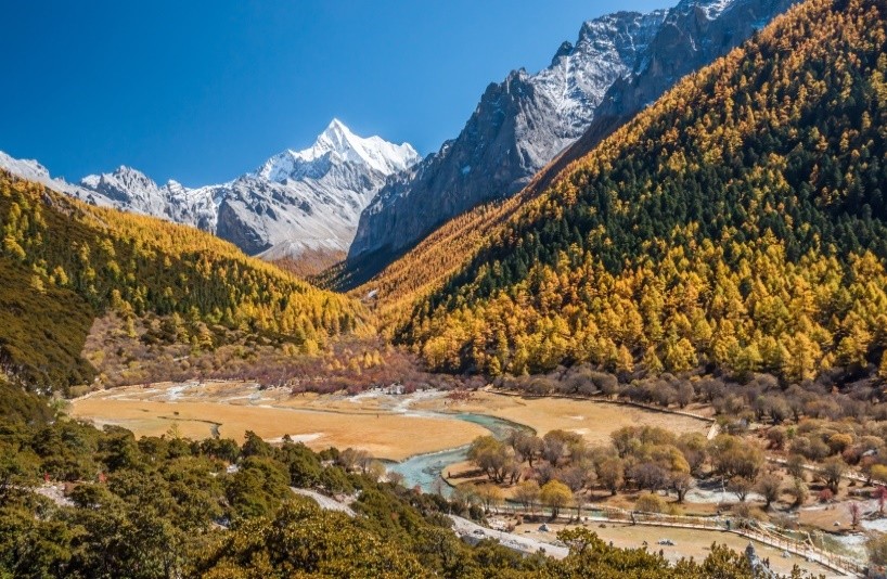 雙橋溝: 以雪峰、牧場、草地、森林為主,是四姑娘山最美麗的一條山溝。內有兩座木橋,雙橋溝因而得名」。