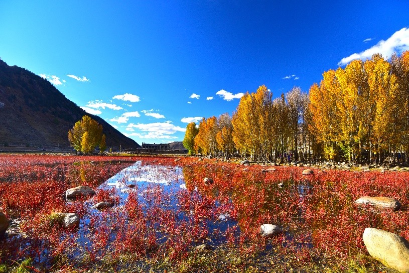 桑堆紅草地: 每當到了秋天,生長在水中的小草逐漸染成了鮮豔的紅色,在高原陽光的照耀下,更加鮮亮。