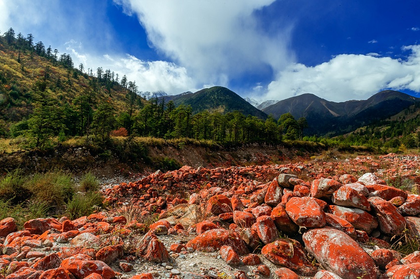 紅石灘: 海螺溝景區內一處獨特的自然奇觀,因岩石表面覆蓋著鮮豔的紅色藻類而聞名,與雪山、冰川、森林共同構成一幅絢麗畫卷。