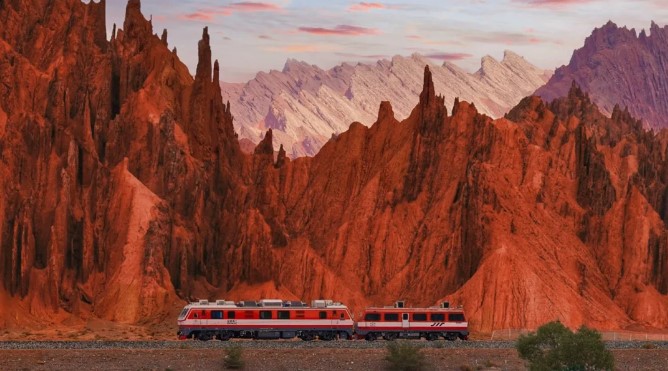 紅山石林: 山體呈紅色,原海底的岩石由於造山運動而形成直立單斜岩石組成了層層疊疊的“石林”,構成天山奇觀。