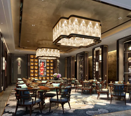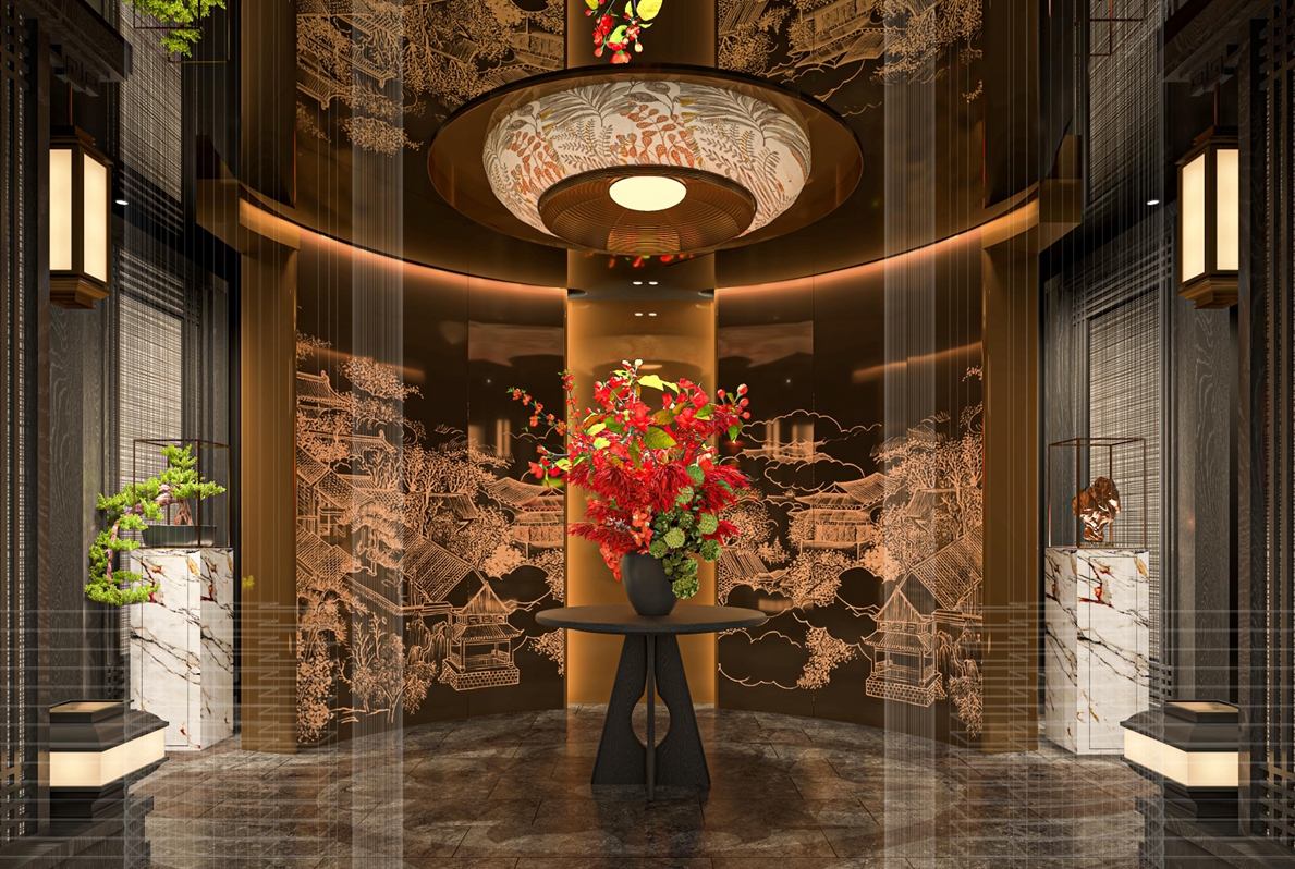 - 迎賓大廳(蜀繡光影牆+芙蓉宮燈)—餐吧區(蜀錦座椅+川味風物展)—茶吧雅室(宋式茶寮+枯山水造景)