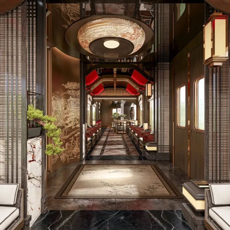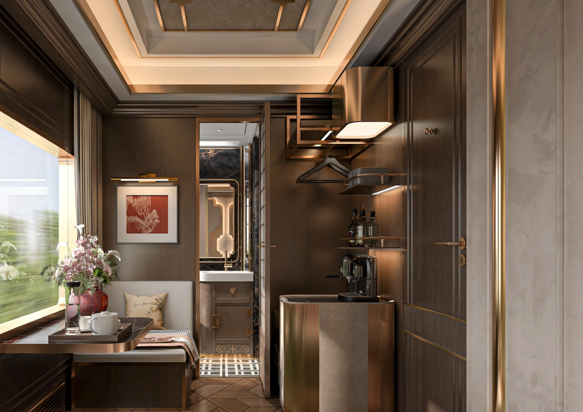 錦繡天府號列車的設計靈感源于巴蜀文化的“天・地、文・脈、生・活”三道哲學,以現代手法轉譯宋韻美學與蜀地符號,打造集自然、人文與生活美學於一體的“移動東方美學殿堂”。列車配備奢享與品質雙人房,均設獨立衛浴;多功能客廳車廂可靈活組合滿足宴聚、茶敘需求;觀景娛樂車廂融合手作、棋牌與觀景功能,提供多樣旅居樂趣。