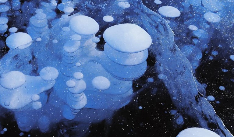冰封期的湖面出現“藍冰”景觀,晶瑩剔透,閃耀著藍色的光芒,令人震撼。