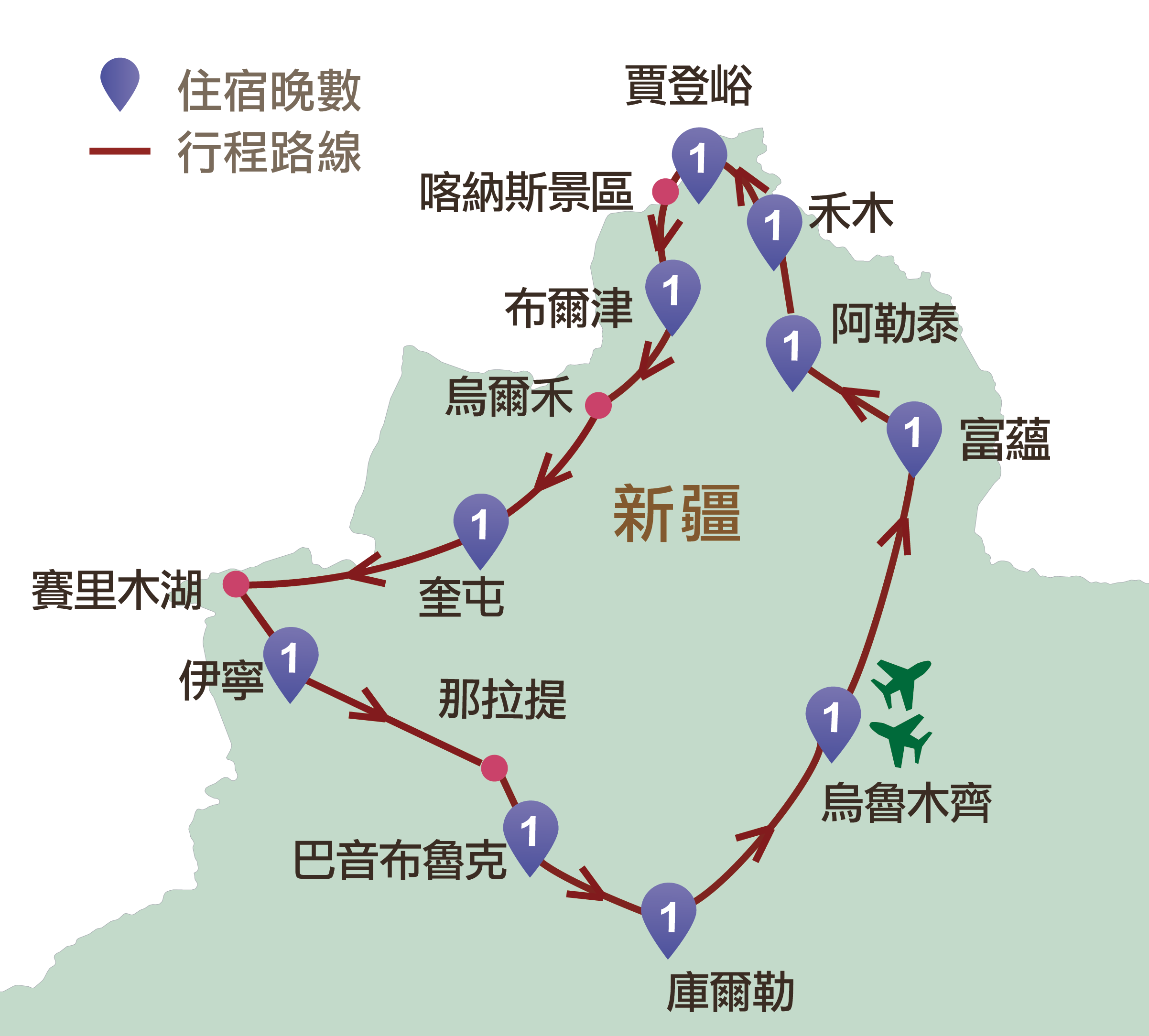 烏魯木齊、天山天池、準噶爾盆地、可可托海、阿勒泰、禾木、喀納斯、布爾津、烏爾禾、奎屯、賽里木湖、