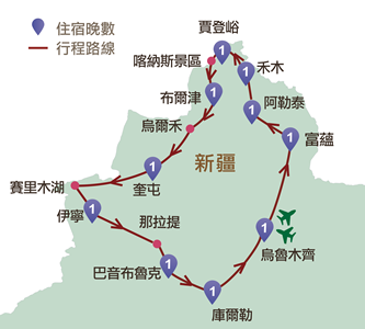 果子溝、伊寧、天山花海、那拉提、獨庫公路、巴音布魯克、輪巴公路、庫爾勒、博斯騰湖、天山勝利隧道