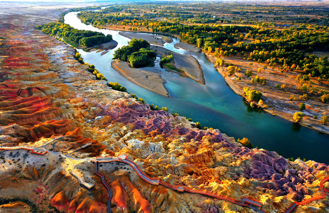 五彩灘: 以雅丹地貌著稱的河灘。奇特的丘陵地質,顯示出多種色彩,每到陽光照耀時,顏色絢爛奇幻,非常壯觀。