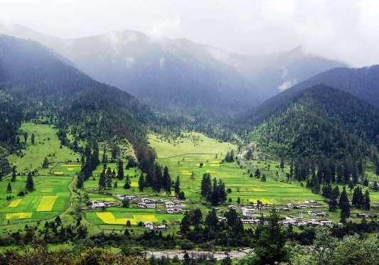 魯朗國際小鎮: 是一個被群山環抱的寧靜小鎮。鎮上到處是木屋、籬笆的田園風光。遠處群山上雲霧繚繞,高山草甸上野花遍野,景色優美。