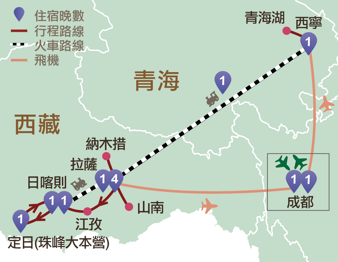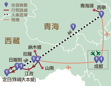 成都、西寧、青海湖、拉薩、納木措、山南、羊卓雍措、江孜、日喀則、珠峰大本營