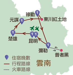 昆明、楚雄、元謀、東川紅土地、彌勒、普者黑