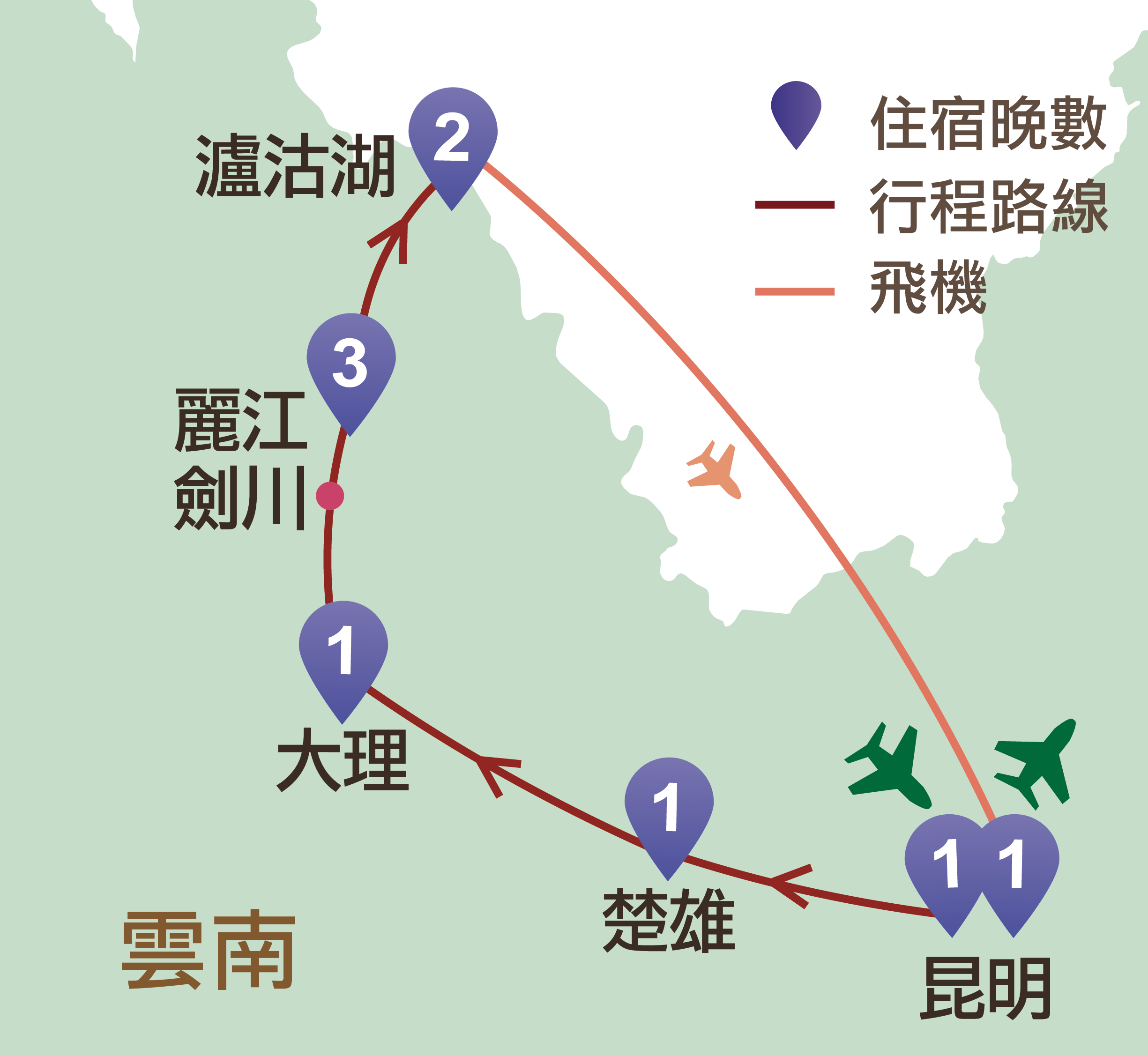 昆明、楚雄、大理、劍川、麗江、瀘沽湖