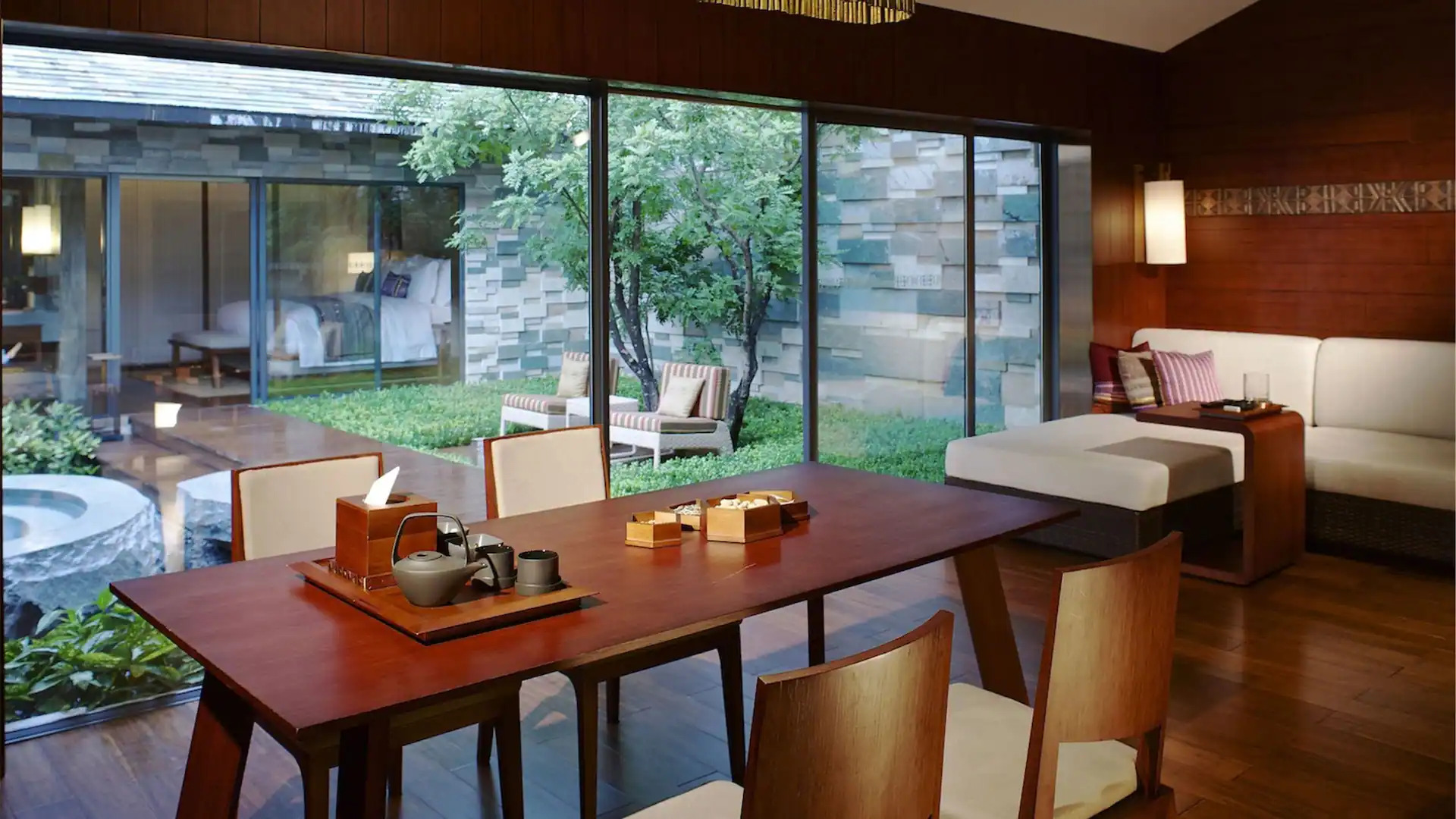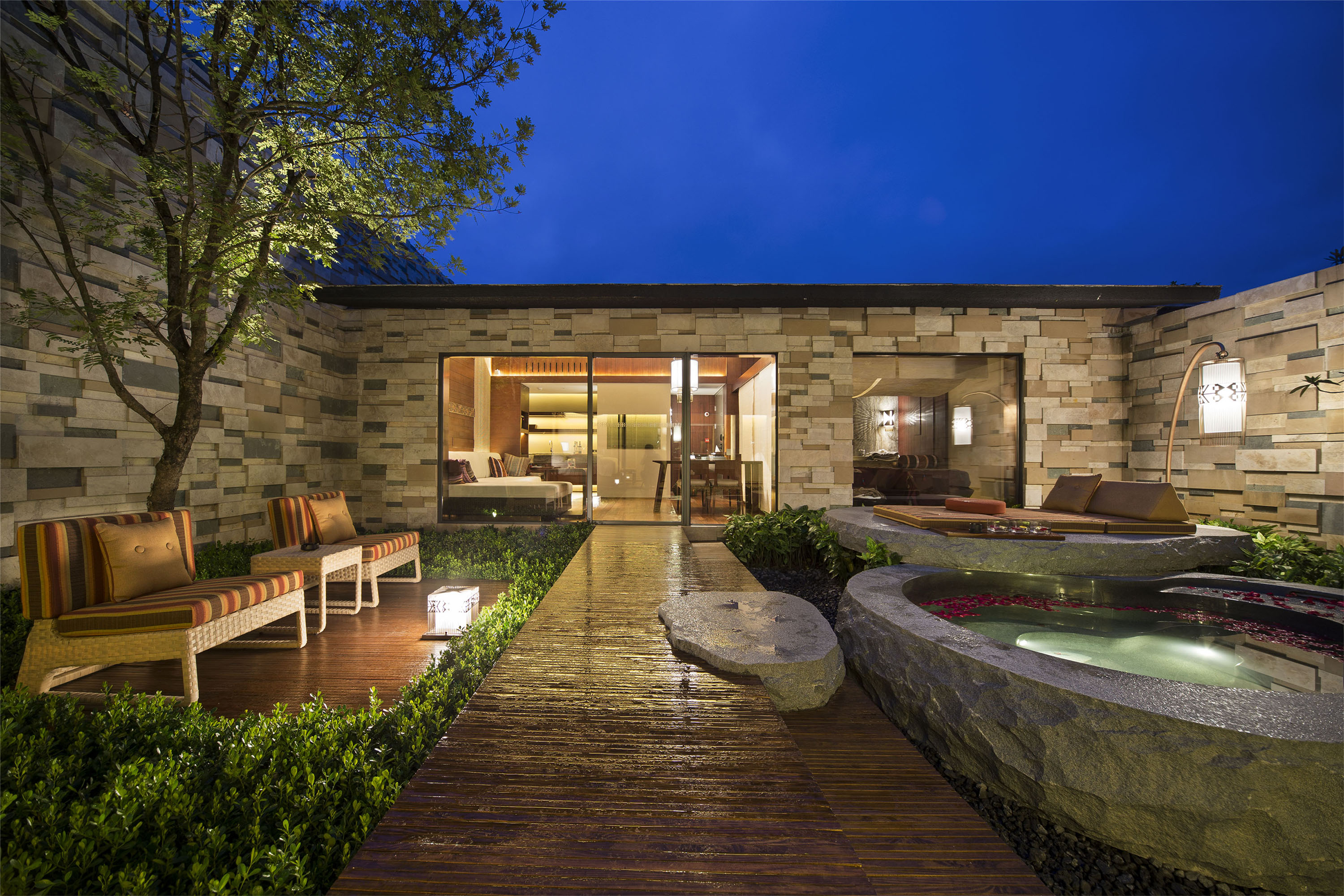 酒店全別墅設計住宿,室內建築面積都在90平方米以上,並擁有一個不少於50平方米的私家內庭院室外空間,所有別墅均為一層獨立結構。別墅內庭花園內精心雕琢的巨型花崗岩泡池、天然的優質碳酸溫泉、道Spa理療共同打造出「石頭紀」的核心靈魂—奢華溫泉湯浴空間。房間呈「工」字形佈局,空間感與設計感融合得恰到好處,客廳與卧室用庭院巧妙分開,即可共享藍天白雲和鳥鳴,又有私密空間,是可以足不出戶悠然度日的「享樂室」。