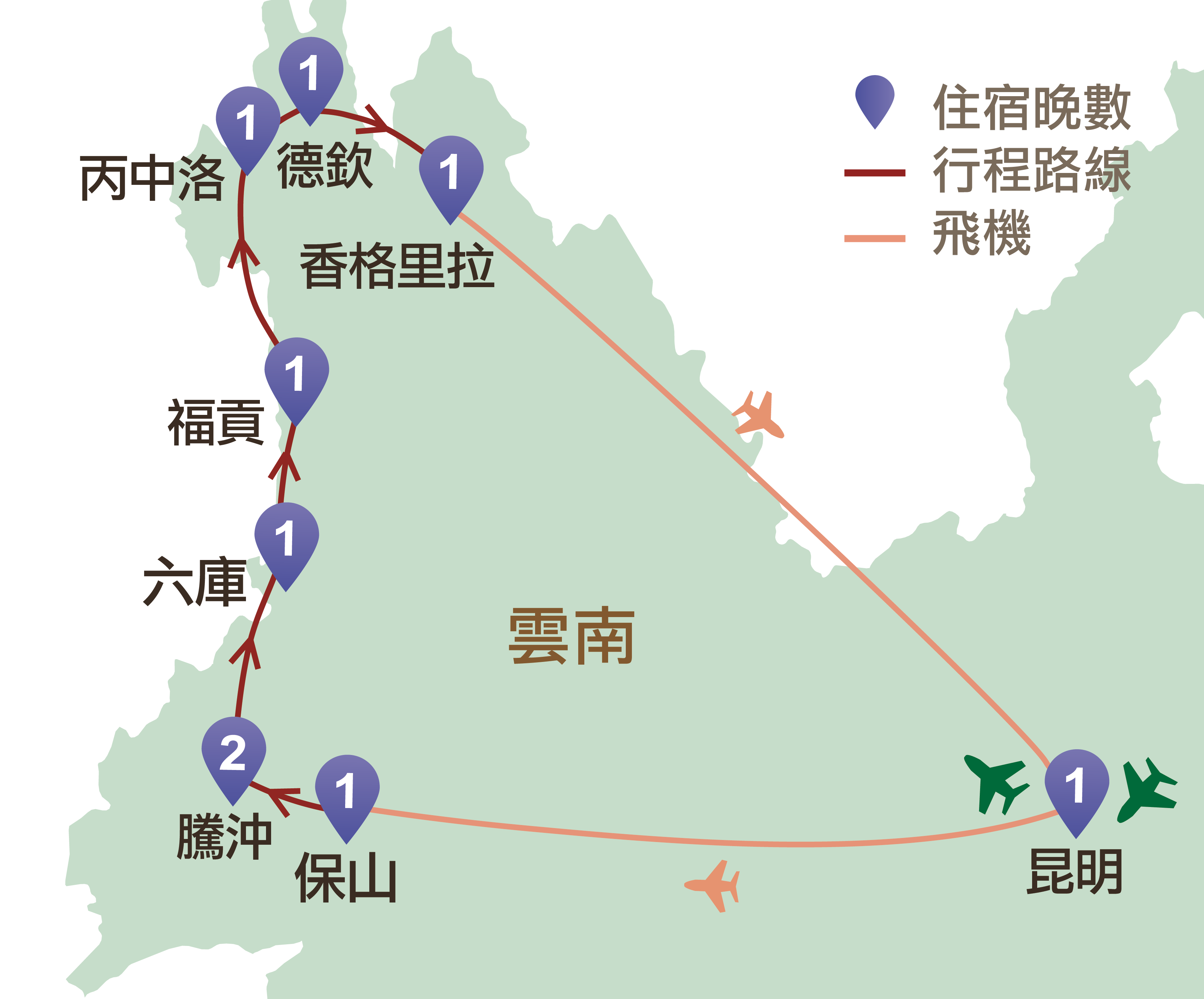 昆明、保山、騰沖、六庫、福貢、丙中洛、德欽、香格里拉