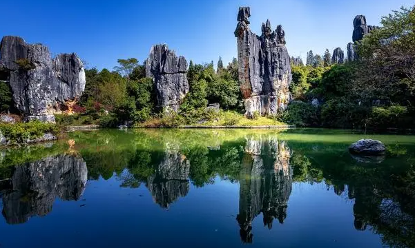 石林風景區: 高大的劍狀、柱狀、蘑菇狀、塔狀等石灰岩柱是石林的典型代表。幾乎世上所有喀斯特形態都集中在此。