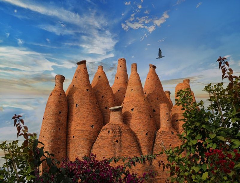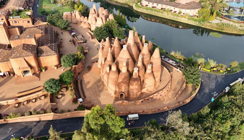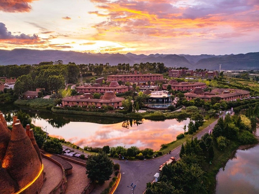 東風韻小鎮: 將三種當地文化混合,酒瓶狀建築代表彌勒的紅酒文化,還有彝族的火文化建築及共生的文化建築。