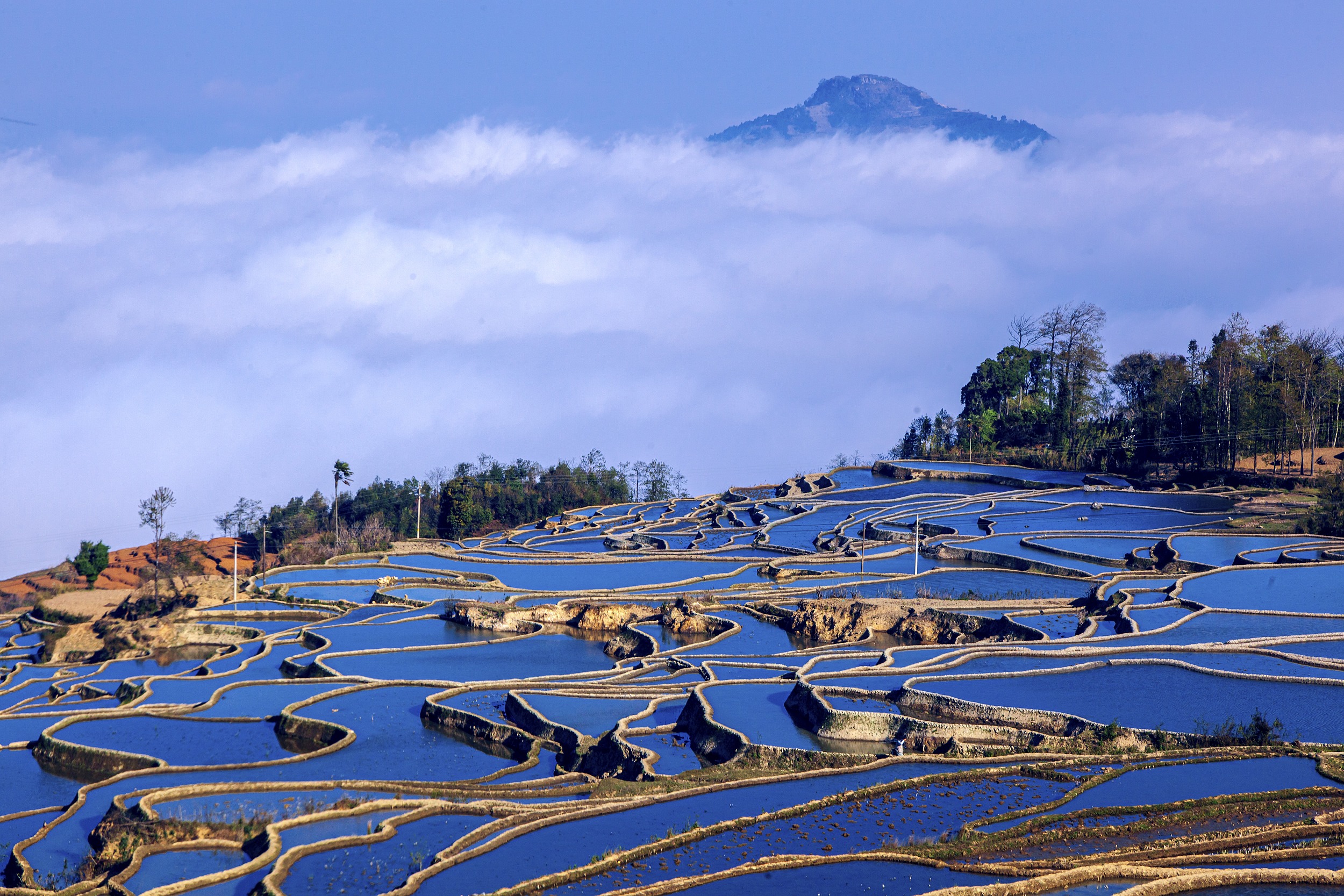 多依樹梯田: 景區上萬畝梯田,像版畫一樣連綿壯觀。尤其是日出的時候,朝陽的光輝在梯田水面跳躍,變幻多彩。