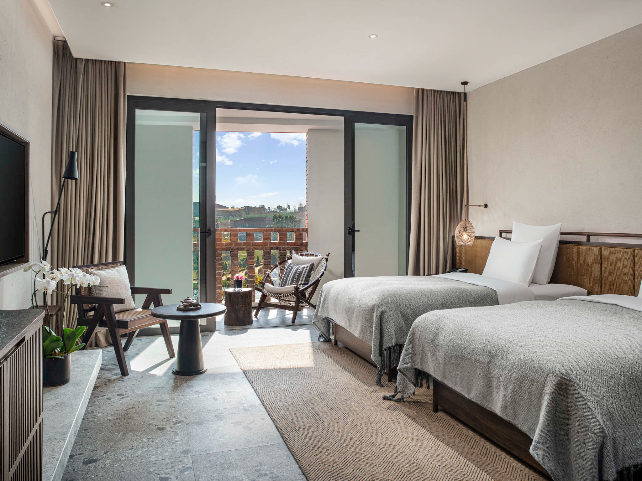 酒店屬雅高集團(Accor)旗下品牌,強調在地文藝創作及自然環境的融合,酒店置身由葡萄園、薰衣草地和大批後現代建築構成的東風韻藝術小鎮,整家酒店外牆幾乎都以紅色磚塊建造,並以數個巨大橢圓形土樓式主體建築群組成,層層而下,散落在寧靜湖邊,由高空看,猶如一個巨大舞台,充滿後現代的創新風格。