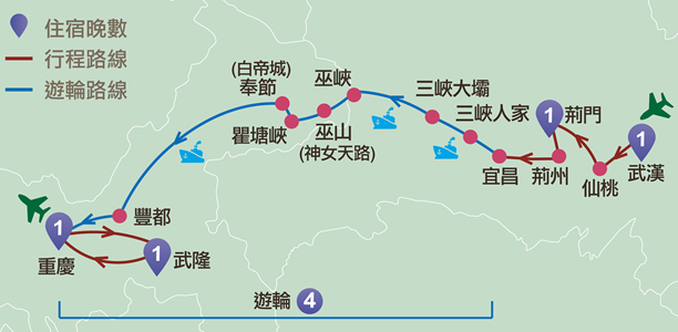 武漢、仙桃、荊門、宜昌、三峽大壩、三峽(巫峽、瞿塘峽)、巫山神女天路、奉節、豐都、重慶、武隆