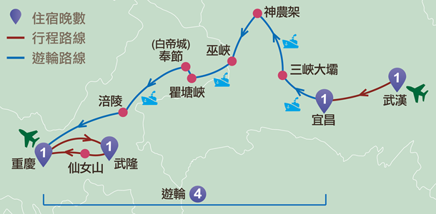 武漢、荊州、宜昌、三峽大壩、神農架、巫峽、瞿塘峽、奉節、涪陵、重慶、武隆、仙女山
