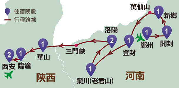 河南(鄭州、開封、新鄉、登封、欒川、洛陽、三門峽)、陝西(華山、臨潼、西安)