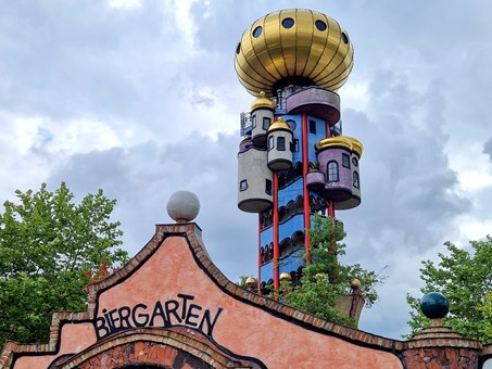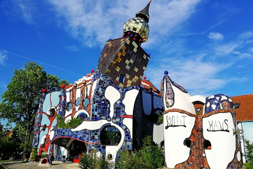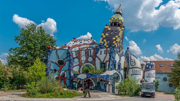 斜塔以波浪形屋頂和色彩斑斕的外牆而聞名,設計不僅美觀,還能有效地收集雨水並促進生態平衡。整個藝術中心採用可再生材料建造,並設有綠化屋頂和花園,能夠在欣賞藝術的同時,也感受到大自然的氣息。裡面展覽了許多百水先生的繪畫真跡作品、生前所用過的工作室用品以及生前留下來的相片。