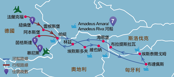 德國:法蘭克福、符茲堡、羅登堡、紐倫堡、雷根斯堡、帕紹、茵格斯達、慕尼黑
