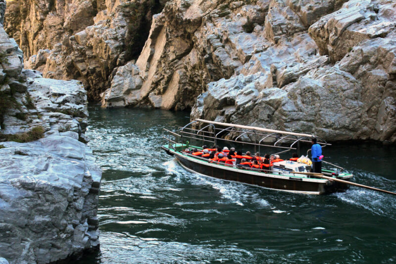 乘船由大步危峽谷出發,順流而下,沿途可見蝙蝠岩、獅子岩等兩岸聳立的岩壁,體驗山谷之美。
