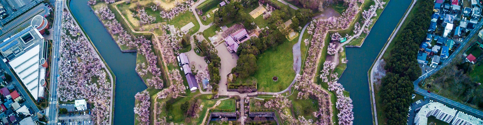 獲國家指定為特別史蹟的五稜郭遺跡。每年春天,櫻花樹在陽光下盛開,形成壯觀的粉紅色海洋。