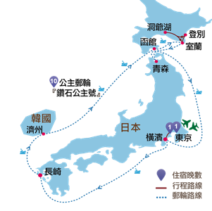 日本:東京、橫濱、長崎、函館、室蘭、登別、洞爺湖、青森