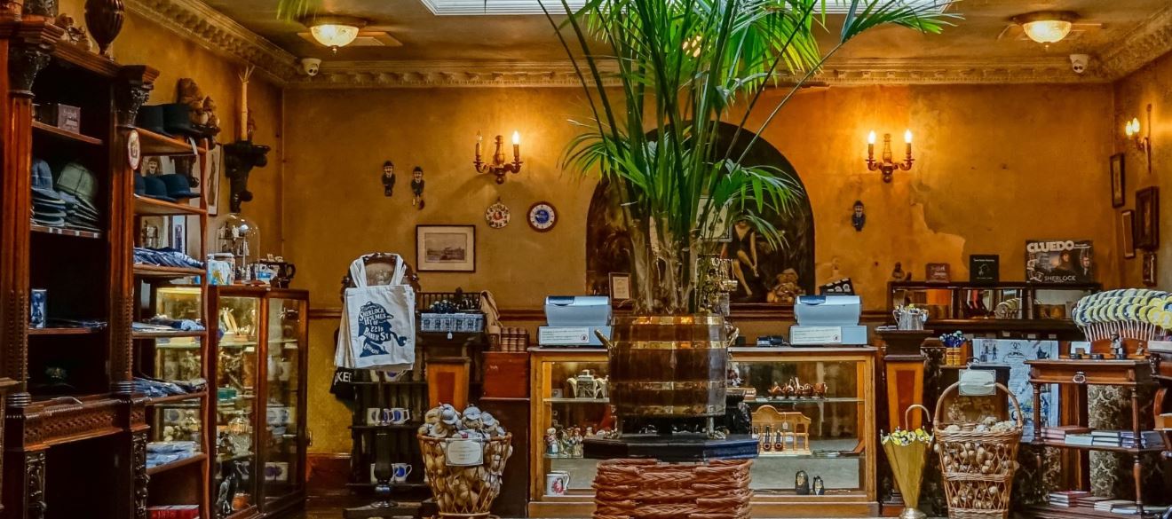 店內裝飾有19世紀倫敦街景和偵探故事插畫,販售各式福爾摩斯主題商品。