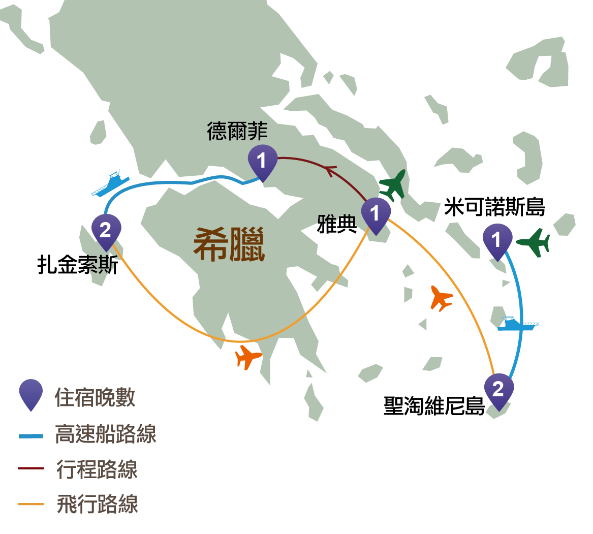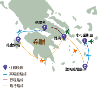 米可諾斯島、聖淘維尼島、雅典、德爾菲、扎金索斯