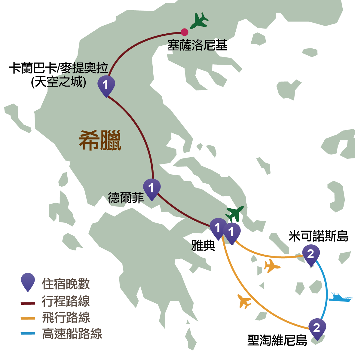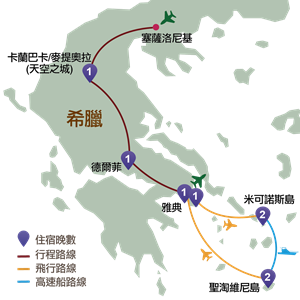 塞薩洛尼基、卡蘭巴卡、麥提奧拉(天空之城)、德爾菲、雅典、米可諾斯島、聖淘維尼島