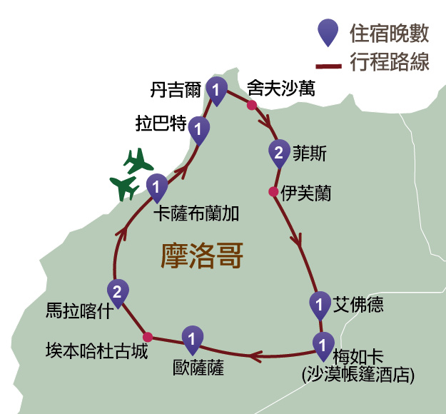 卡薩布蘭加、拉巴特、艾⻄拉、丹吉爾、舍夫沙萬、菲斯、艾佛德、梅如卡、撒哈拉沙漠、廷吉爾、歐薩薩、埃本哈杜古城、馬拉喀什