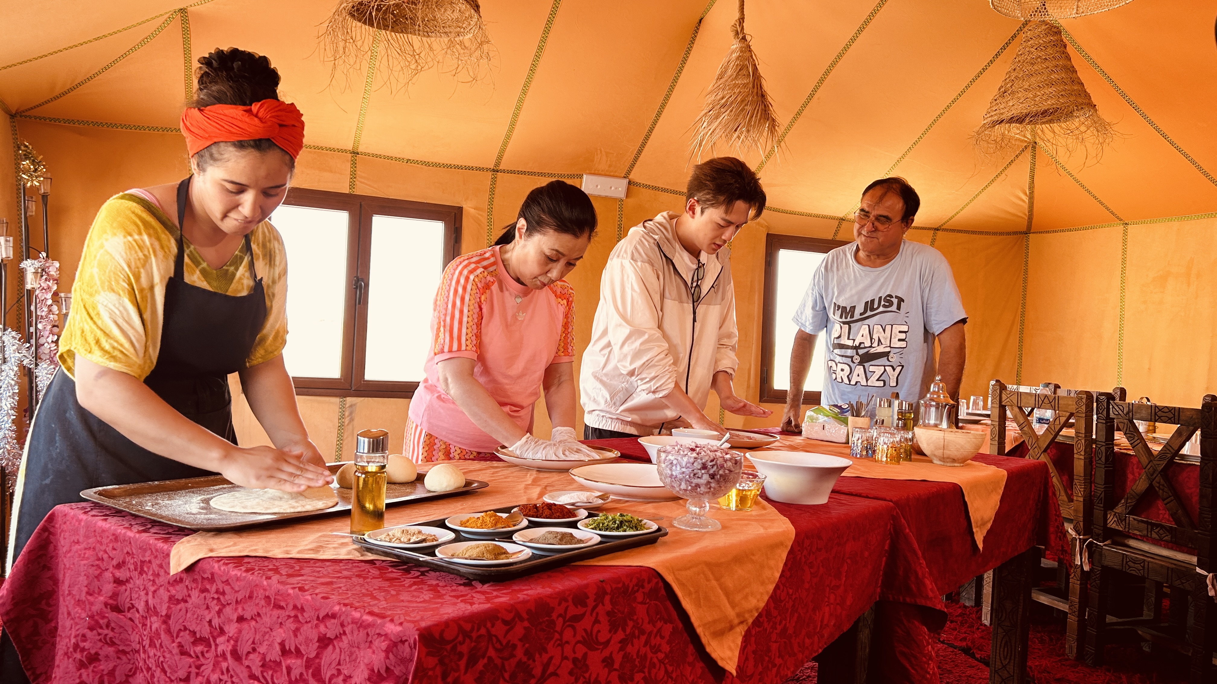 親手製作沙漠傳統美食—柏柏爾薄餅。柏柏爾人家庭都會在節日做薄餅。乍看之下只是㇐個大而圓的麵包,實則內裡充滿美味的蔬菜和肉餡,完成後可享用自己的佳作。