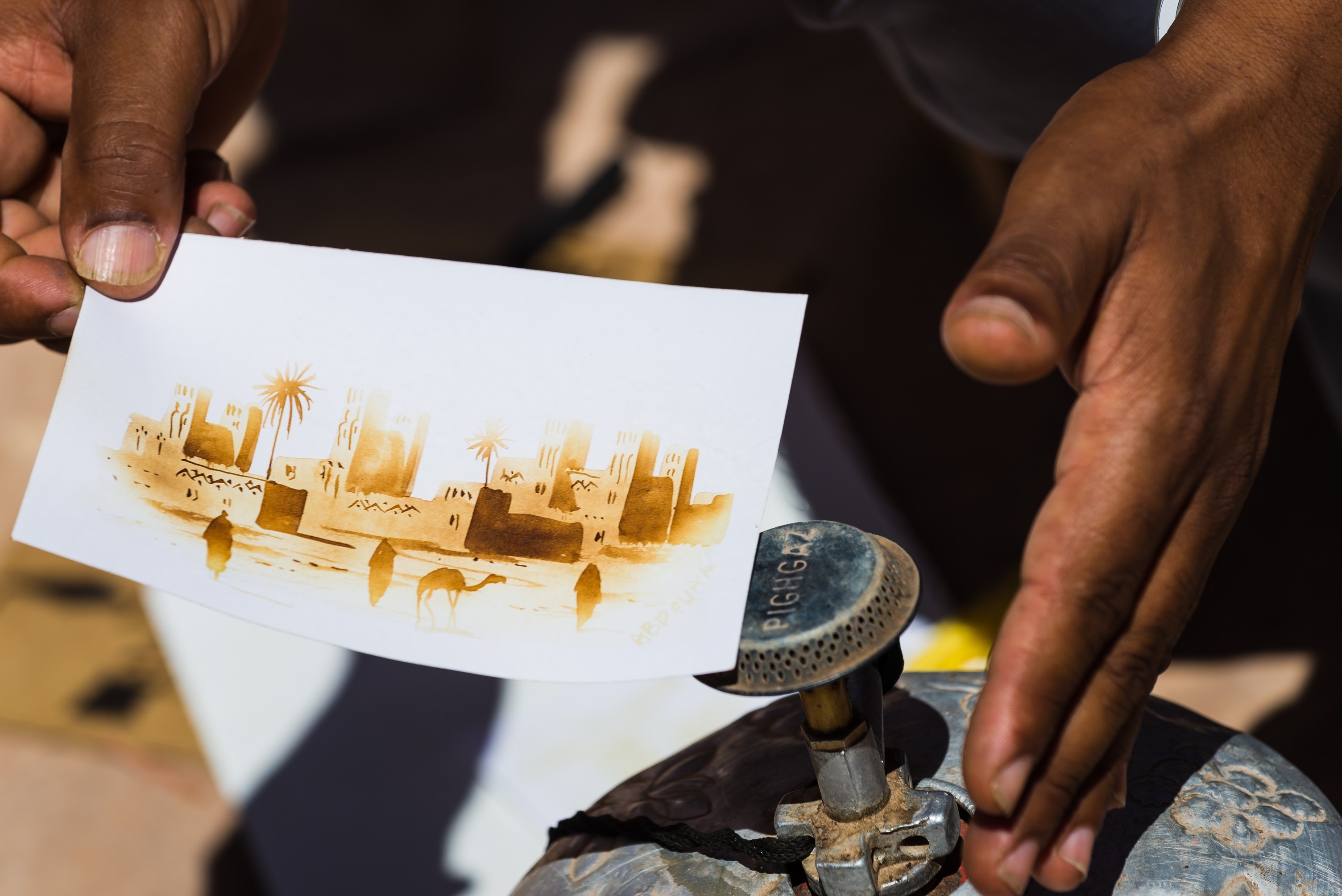 燃畫是摩洛哥柏柏爾部落獨有的古老藝術。藝術家以摩洛哥茶、藏紅花為顏料,在畫布上繪製輪廓後,精準地以火焰在畫紙背後燻烤,透過控制火舌的遠近與燻烤時間,紙張會自然顯現出深淺不一的焦褐色層次。