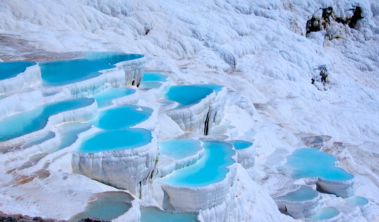 棉花堡觀景區:1988年被列為世界文化遺產。泉水中含有豐富鈣質,由地底湧出的泉水冷卻並沉積下來的石灰質經過長年累月變成棉花狀的石灰岩層,最後形成宏偉的棉花堡。