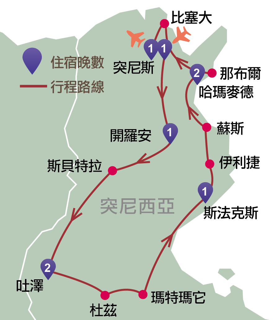 突尼斯、西迪布賽伊德、開羅安、斯貝特拉、吐澤、杜茲、瑪特瑪它、斯法克斯、蘇斯、哈瑪麥德、那布爾、花園半島