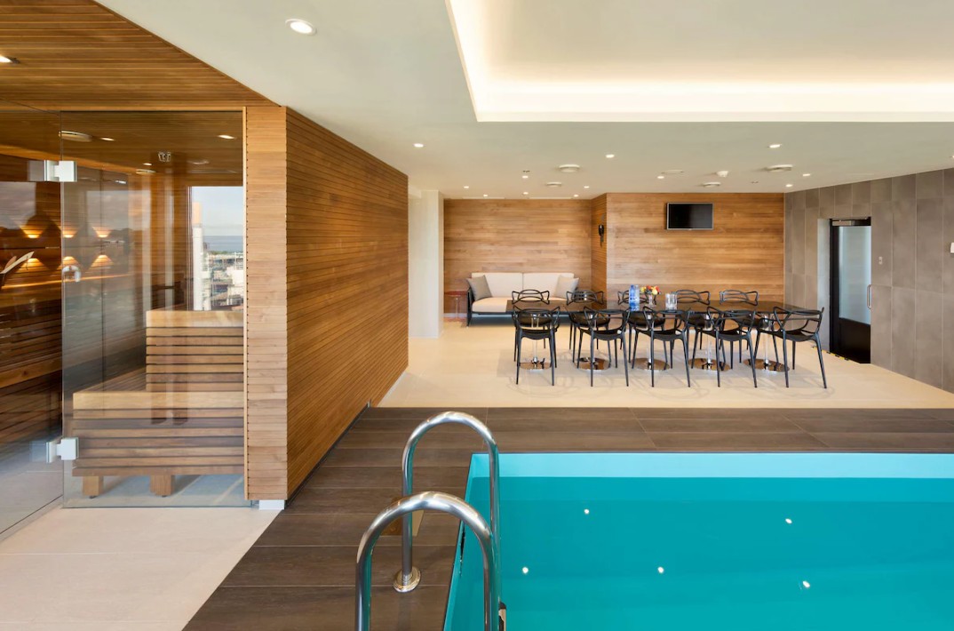 設有獨立廚房、兩間臥室、浴室、桑拿房、獨立洗手間和玻璃露台。