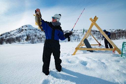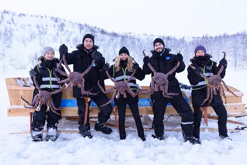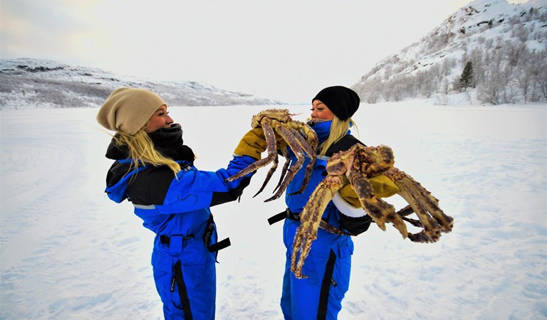 特別安排乘坐雪上電單車拉雪橇前往結冰的峽灣,到事先勘察的冰洞旁,由專人講解及即席將捕蟹籃從洞內拉出,團友更有機會親手拿獲體型龐大的帝王蟹拍照留念! 乘雪橇返回木屋後,品嚐肉質鮮美的帝皇蟹。(提供保暖衣物)