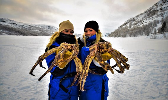 特別安排乘坐雪上電單車拉雪橇前往結冰的峽灣,到事先勘察的冰洞旁,由專人講解及即席將捕蟹籃從洞內拉出,團友更有機會親手拿獲體型龐大的帝王蟹拍照留念!乘雪橇返回木屋後,品嚐肉質鮮美帝皇蟹。(提供保暖衣物)