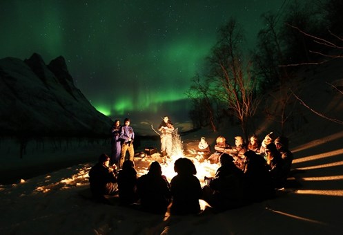 前往極光觀賞營,舒適環境中走進遠離光害的環境中,追蹤如夢似幻北極光外,更可透過解說了解北極光的傳說與資料。在溫暖營火會中享用熱飲及小吃,窩心貼心。(提供保暖衣物)