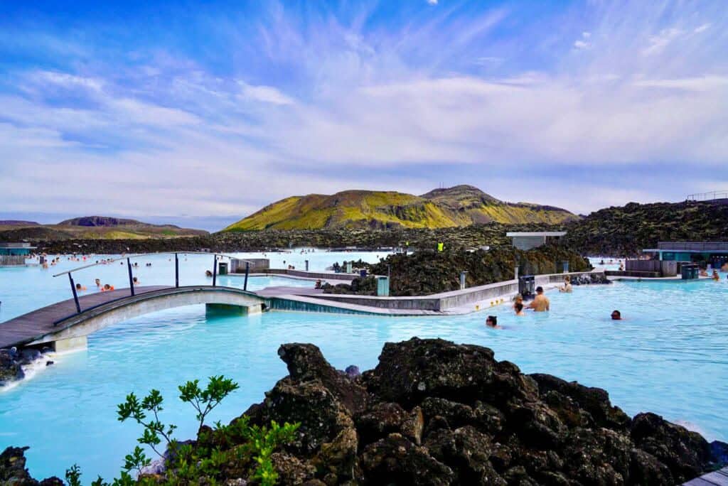 藍湖溫泉:冰島著名地熱溫泉。附近發電廠將發電後的熱水排出至低窪的火山岩地,熱水溶解岩層裡的礦物質,形成煙霧嬝嬝的藍色溫泉水。湖水溫度介於攝氏 37~39 度之間,含礦物質,具有護膚功效,是個溫泉天堂。