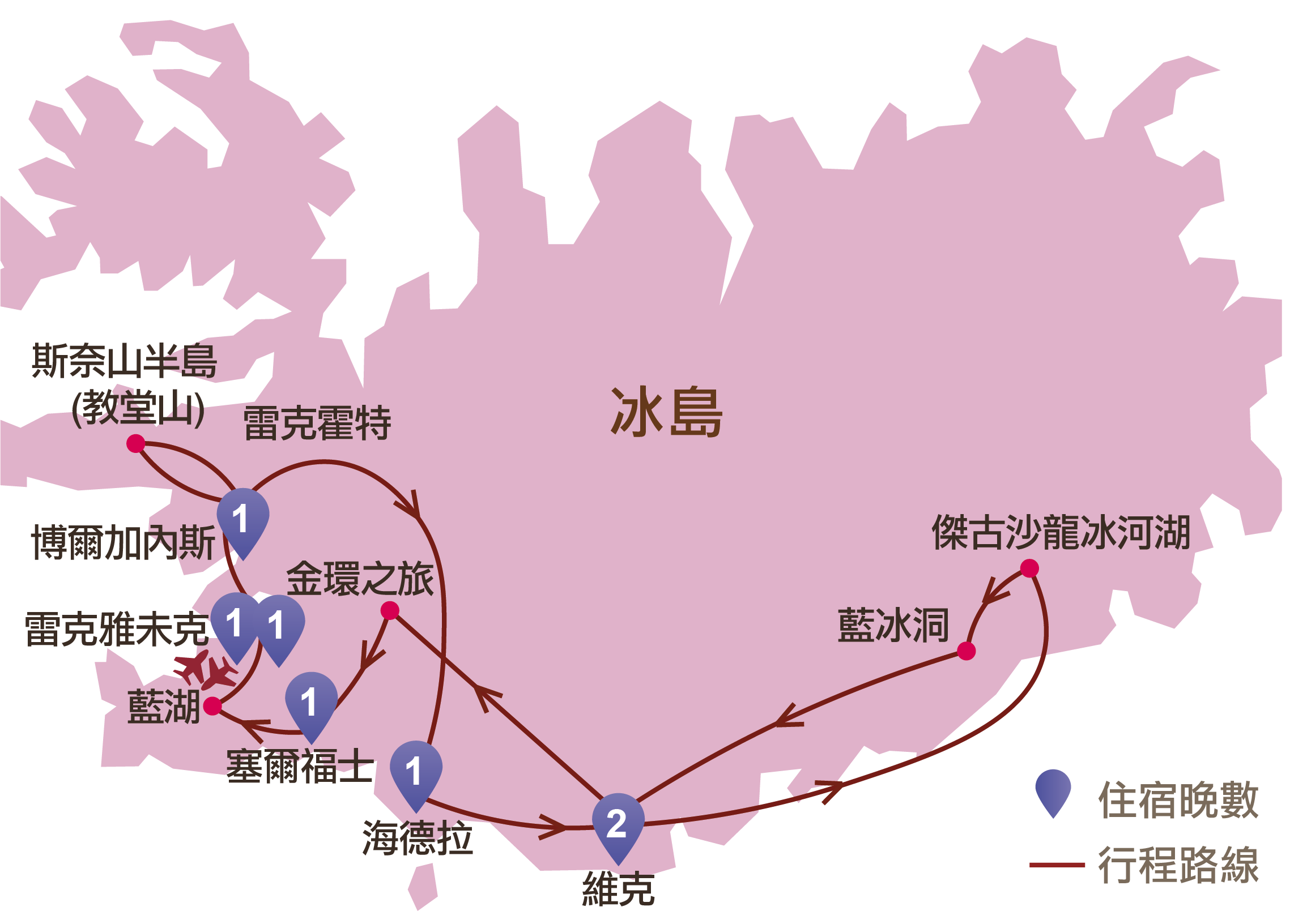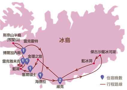 冰島︰雷克雅未克、阿克拉內斯、斯奈山半島教堂山、博爾加內斯、雷克霍特、海德拉、維克、傑古沙龍冰河湖、鑽石沙灘、藍冰洞、科克拜亞克勞斯特、塞爾福士、藍湖