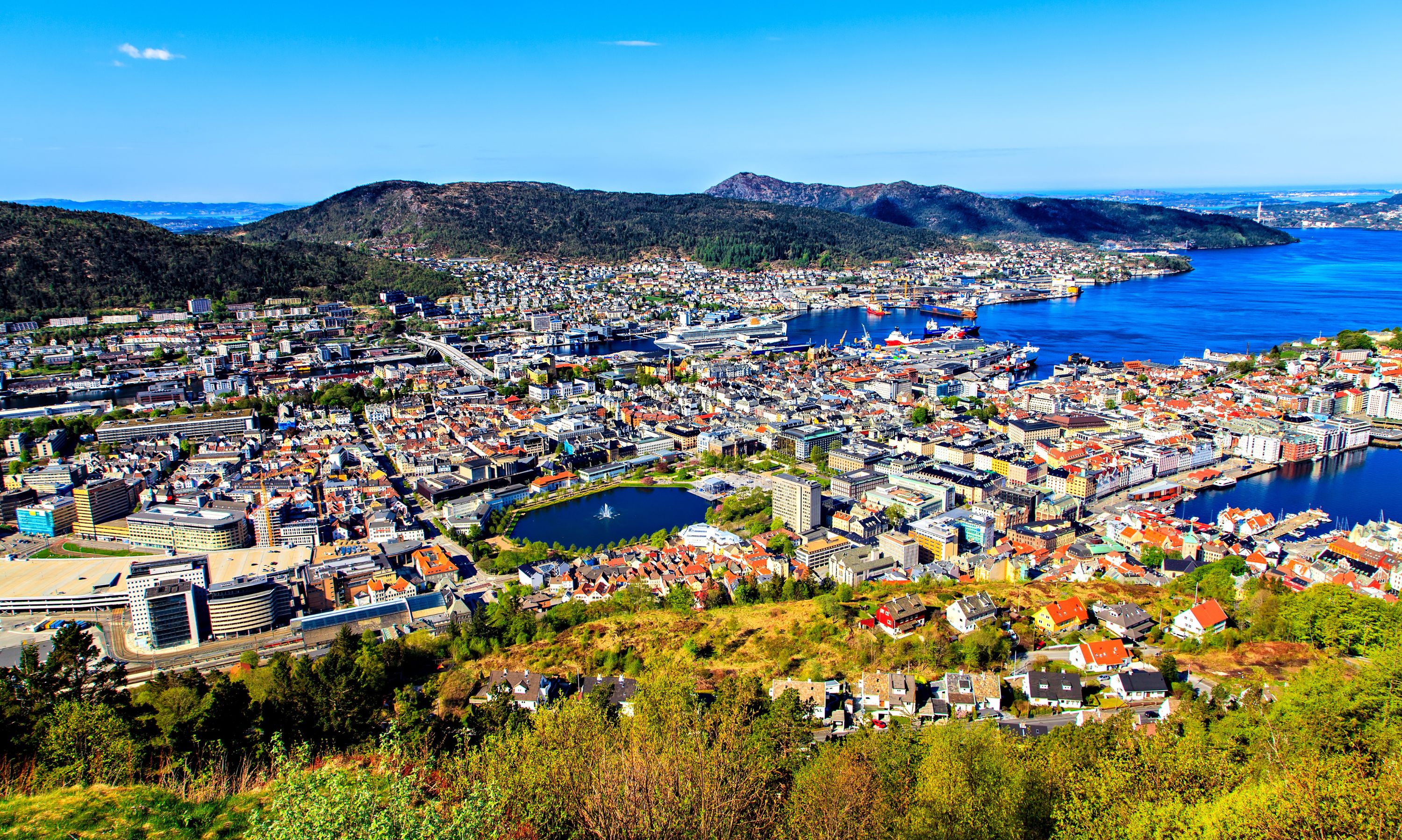 搭乘纜車登上佛洛依山頂,俯瞰卑爾根市容及 峽灣海口壯觀美景。