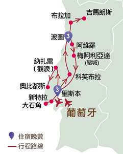 暢遊:波圖、布拉加、吉馬朗斯古都、阿維羅、梅阿利亞達(豬城)、科英拉布、納扎雷、里斯本、大石角(羅卡海岬)、新特拉、奧比都斯