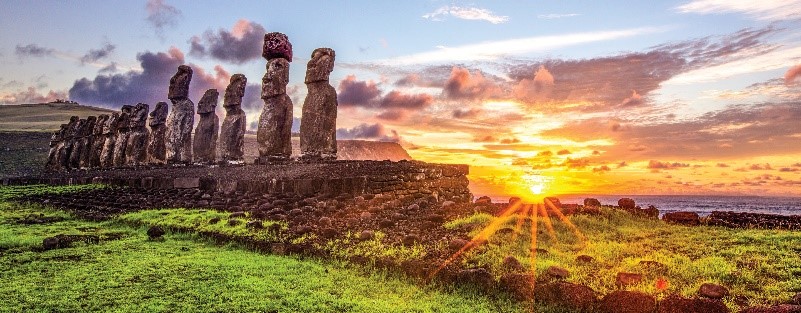 荷蘭人羅根維在 1772 年的復活節那天,發現了這個奇妙的島嶼,因此命名為復活節島。最引人注目的是遍布於島上超過 800 尊巨大無比的巨人石像:摩艾 (Moai) ,摩艾是由整塊石頭雕刻而成,雕工極為細緻,絲毫沒有刻痕。至今仍令人百思不解,在西元前 1680 年,古人是利用何種技術與工具,切割硬度極高的石塊,並刻出這栩栩如生的石像。