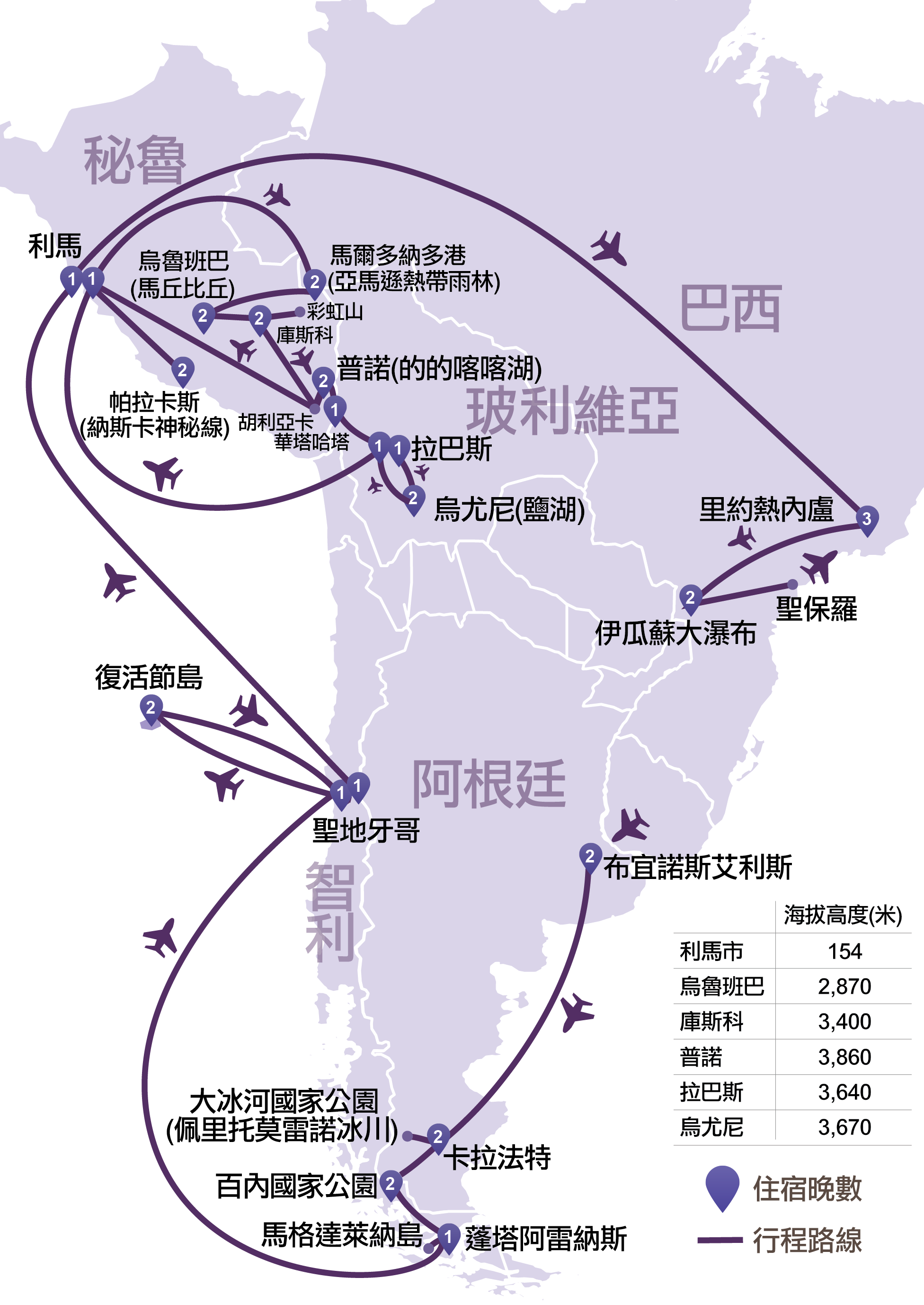 秘魯 :利馬、坦博帕塔國家自然保護區(亞馬遜雨林)、庫斯科、 烏魯班巴、馬丘比丘古城、彩虹山、胡利亞卡、普諾(的的喀喀湖)、帕拉卡斯、巴雷斯塔思島