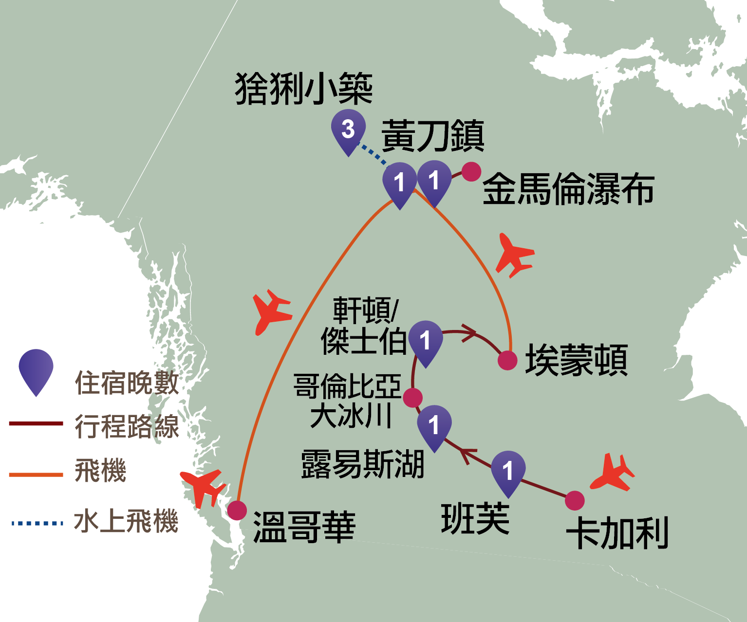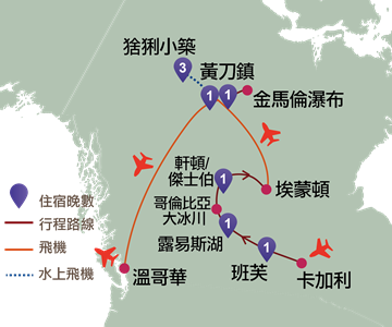 班芙、硫磺山、班芙小鎮、露易斯湖、傑士伯、埃蒙頓、黃刀鎮、猞猁小築