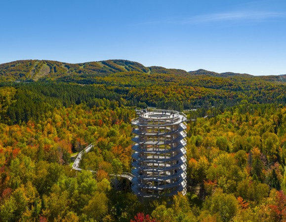 漫步於森林頂層的空中步道。木棧道上,欣賞壯闊的聖羅倫斯河與洛朗山脈全景。其核心是一座高約40公尺的螺旋觀景塔,登頂後能360度俯瞰秋日楓紅。