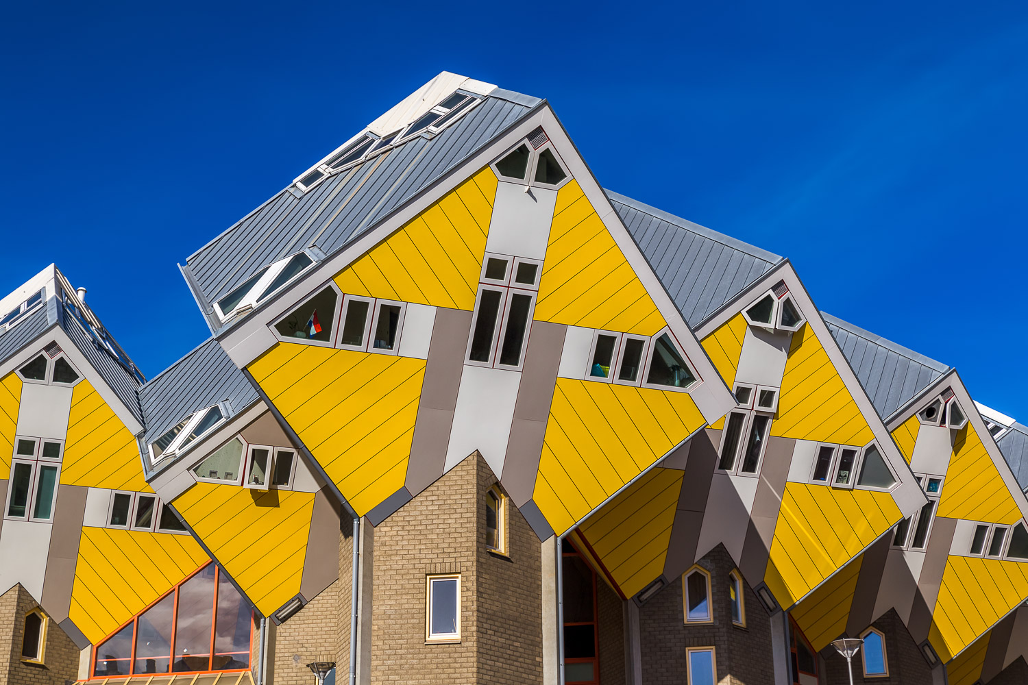 像一個巨大的魔方,獨特的外形使它成為鹿特丹的經典地標建築。整個建築由40幢方塊房子傾斜45°連接而成,是荷蘭最早的立方體形房子。