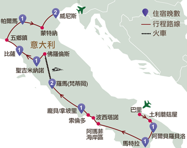 巴里、阿爾貝羅貝洛、馬特拉、阿瑪菲、龐貝、索倫多、拿坡里、羅馬(梵蒂岡)、佛羅倫斯、聖吉米納諾、基安蒂、聖米尼亞托、比薩、五鄉鎮、帕爾馬、蒙特納、威尼斯